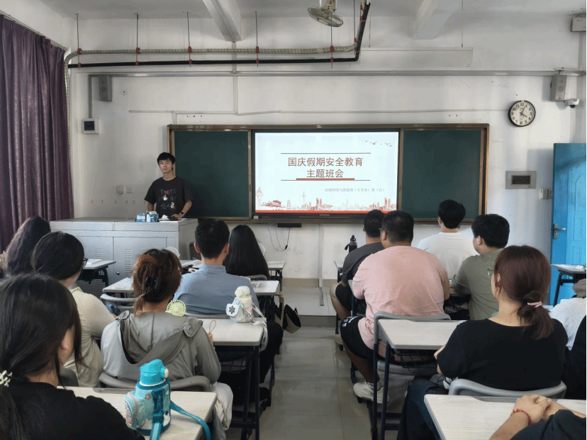 为增强同学们的安全防范意识,确保大家度过一个平安、充实的假期,2025年9月末,传媒会展学院各班召开国庆假期安全教育主题班会。班会由班长主持,围绕出行安全、防诈骗、宿舍消防等重点领域展开,通过案例分析和互动讨论,全面普及安全知识,筑牢校园安全防线。