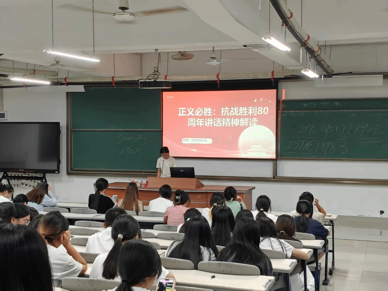 9月25日,由陆煜晗同学主持的“正义必胜:抗战胜利80周年讲话精神解读”主题学习分享会在诚信楼中阶梯教室一顺利举行。现场青年学子齐聚一堂,在沉浸式学习中回望历史、传承精神。