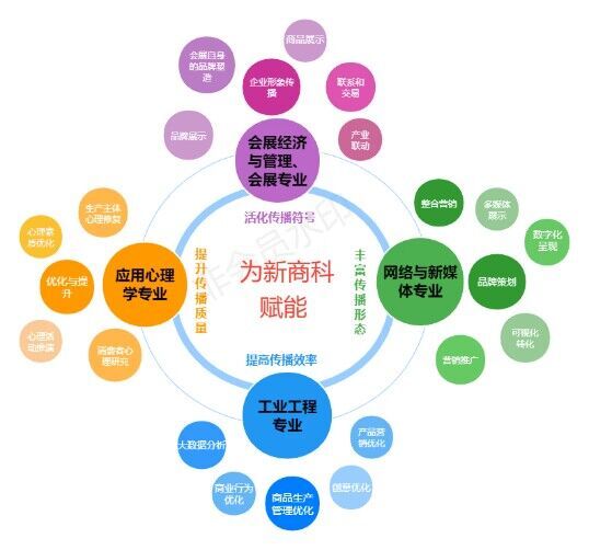 会展经济与管理、会展两个专业,以商品、企业主体的形象传播为主要内容,同时加强会展自身的品牌塑造和营销推广。通过会展专业,实现品牌价值在具体商品展示中的传播,体现具体商品及企业文化的活态传播效应;
