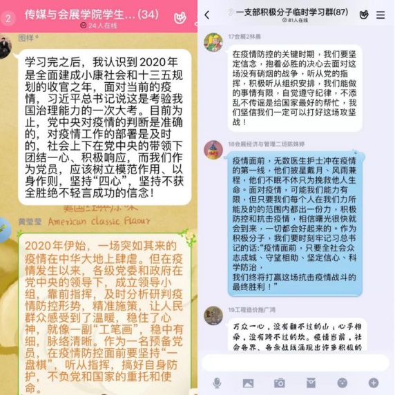 虽是“线上教学”,老师们却毫不懈怠,主动地做好教育教学工作,并设置每日签到以保证学生到位情况。“云课堂”上老师们运用学习通、钉钉、QQ等软件进行直播,并配合PPT等学习资料进行视频讲解,老师们还会针对学生的共性问题对学生进行定时在线答疑和在线辅导,及时解决学习当中出现的问题,尽可能地提高线上教学的效率。在此期间,同学们也认真地记录笔记,课后积极进行答疑与讨论,并且能及时进行师生间的交流沟通。为响应“停课不停学”号召,yl6776永利集团学生党支部也在积极行动。yl6776永利集团学生第一党支部通过线上阅读、交流的方式开展学习习近平总书记在疫情期间发表的讲话等內容。习近平总书记在讲话中谈到:现在最关键的问题就是把工作抓实、抓细、抓落地,并为打赢疫情防控阻击战注入强大信心和力量。同学们在阅读相关文章后,深受鼓舞,纷纷在群里发表了自己的观点与抗疫决心。为了激励同学们积极调整良好心态,学院在安排好学业的同时,也对学生进行心理健康问卷调查,邀请学生聆听专家讲座等心理疏导活动,并运用公众号进行心理文章推送。引导学生掌握科学防疫知识的同时,强化思想,引领学生做好心理疏导工作,帮助学生树立防控疫情的信心和积极的心理,同样是抗击疫情的重要保障。