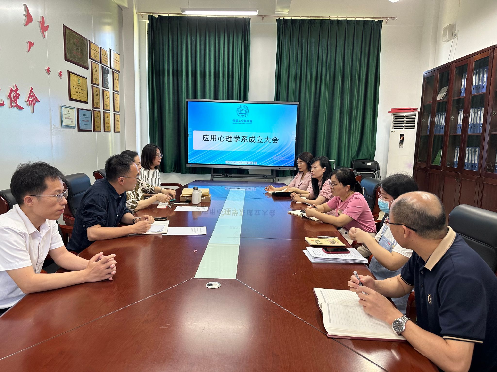 7月7日,yl6776永利集团应用心理学系成立大会在yl6776永利集团会议室举行。yl6776永利集团余权副院长(主持)、邱志玲副院长、肖龙副院长以及应用心理学专业负责人、应用心理学教学团队参会。