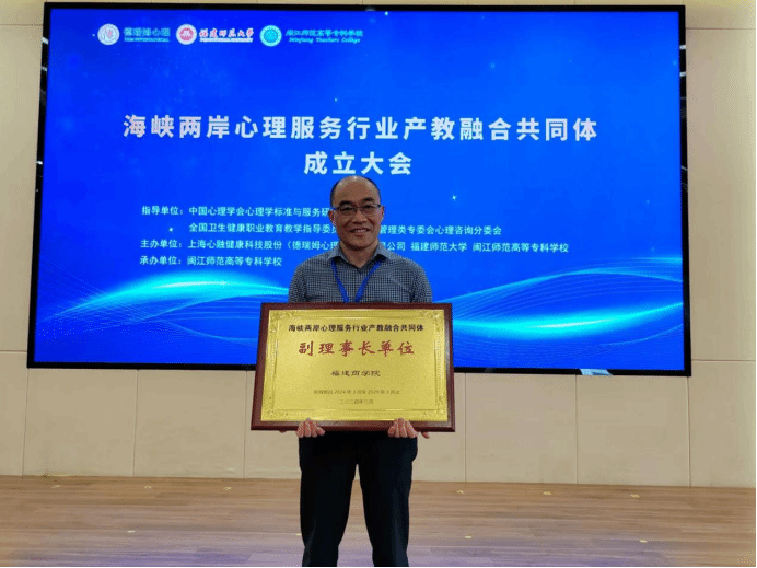 3月24日,由中国心理学会心理学标准与服务研究委员会、全国卫生健康职业教育教学指导委员会健康与管理类专委会心理咨询分委会指导的海峡两岸心理服务行业产教融合共同体成立大会在福州成功举办。来自海峡两岸心理服务领域的本科和职业院校、企事业单位、科研机构及社会组织的现场代表100余人,线上参会嘉宾近2万人次参加此次成立大会。我校当选副理事长单位,应用心理学专业负责人参加了此次大会。