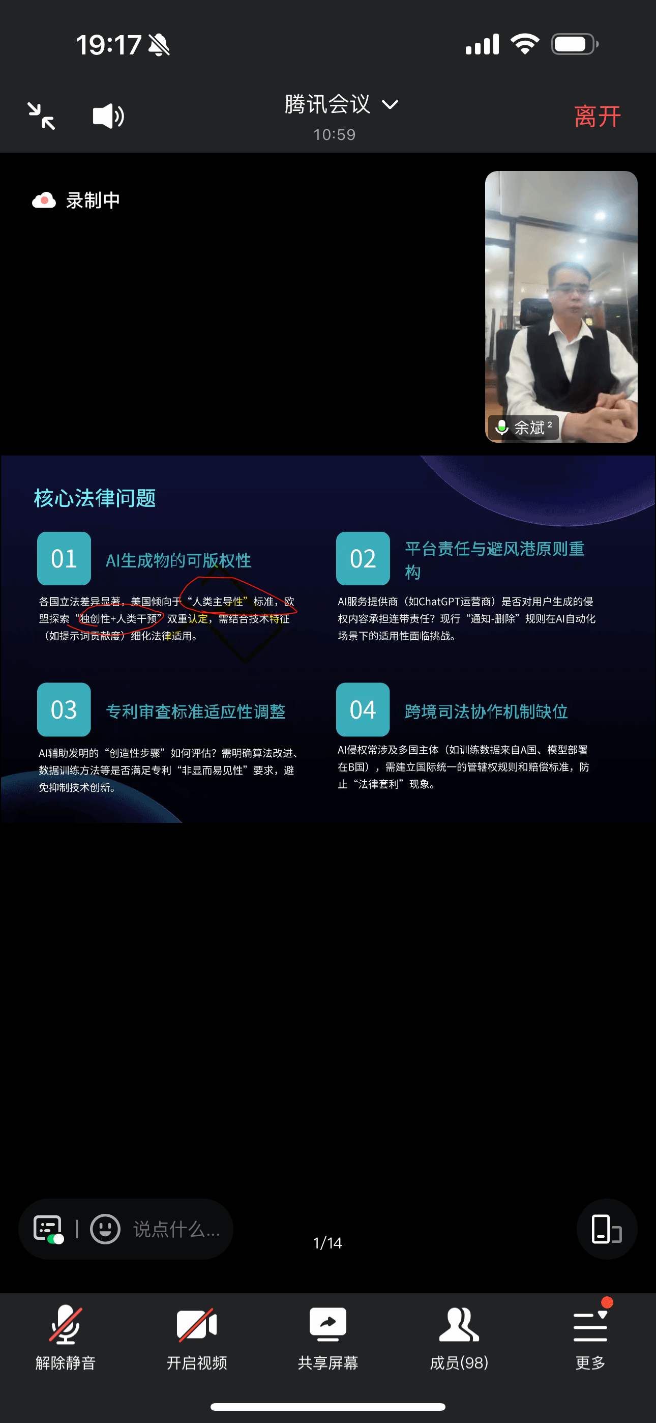 接着,余总分享了中就公司的生成式产品及在相关行业的应用经验,介绍公司知识产权管理细节,重点讲解技术方案的原创性证明等,指出可有效规避AI项目研发中知识产权风险的措施。