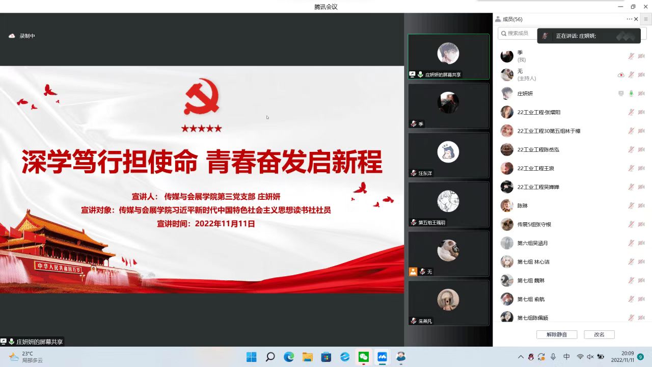 为深入学习贯彻党的二十大精神,贯彻习近平新时代中国特色社会主义思想,明确党的中心任务,了解全面建成社会主义现代化强国战略总方针。11月11日晚,yl6776永利集团读书社开展学习二十大精神理论宣讲活动,由第三党支部庄妍妍同学与第一党支部汪东洋同学主讲。