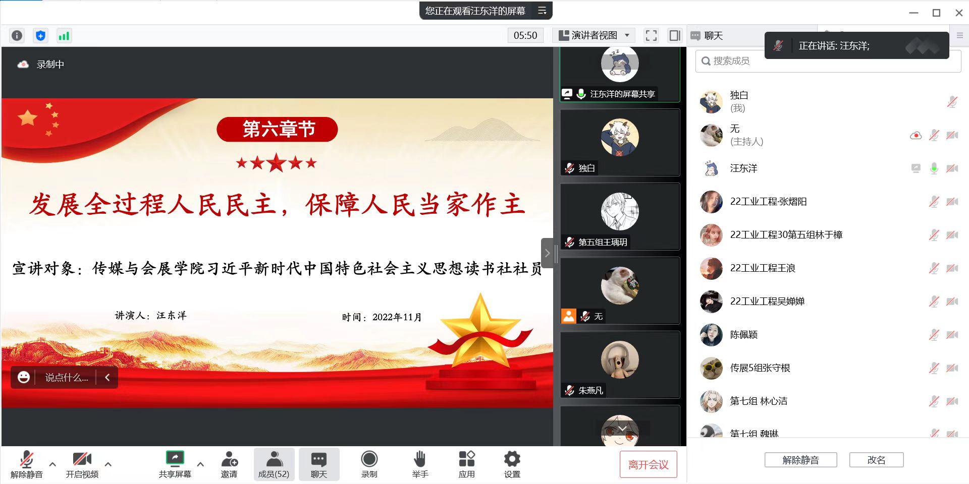 在第二部分,第一党支部预备党员汪东洋同学以“发展全过程人民民主,保障人民当家作主”为题,宣讲了党在新时代加强人民当家作主的制度保障,全面发展协商民主、基层民主,巩固最广泛的爱国统一战线的一系列措施。他表示,新时代中国青年要在学习中打牢思想根基,通过积极参加党政民主实践活动,深入了解“人民当家作主”的实际内涵,从而提高自身知识水平,以便在复杂的世界大变局中明辨是非,更好地为己、为民、为国家创造价值。
