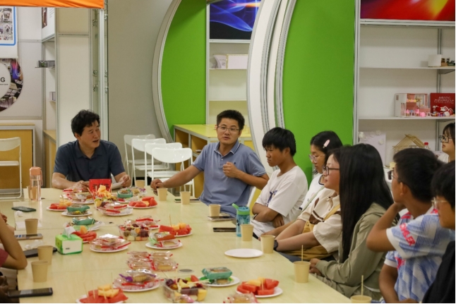 接随着茶话会的深入,同学们进行了热烈的交流互动,分享各自在进入大学以来的喜悦、收获、烦恼、迷茫以及对未来的期待。在轻松愉快的氛围中,两位领导与同学们一起品尝了学院精心准备的各种新鲜的水果和月饼,互相分享了自己的中秋感悟。