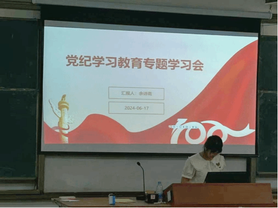 近日,我院第二、四支部在诚信楼中介二召开党纪学习教育专题学习会。本次学习会由余诗雨同志主讲,她以深入浅出的方式,全面阐述了党纪学习教育的重要性,并倡导全体党员将学习成果转化为实际行动,推动党纪学习教育走深走实。
