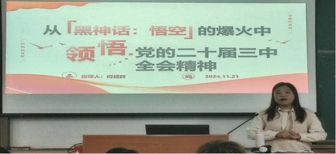 紧接着,何超群老师带领大家观看了《黑神话:悟空》的宣传视频。通过观看视频,入党积极分子们深刻感受到了国产游戏产业的崛起与中华文化的魅力。何超群老师进一步分析指出,《黑神话:悟空》的成功并非偶然,它与党的二十届三中全会精神有着紧密的联系。游戏的高品质追求和精益求精的态度,正是党的二十届三中全会所倡导的深化改革、高质量发展的生动体现;同时,游戏对传统文化的深入挖掘和传承,也与党的二十届三中全会提出的坚定文化自信、推动社会主义文化繁荣兴盛的要求不谋而合。