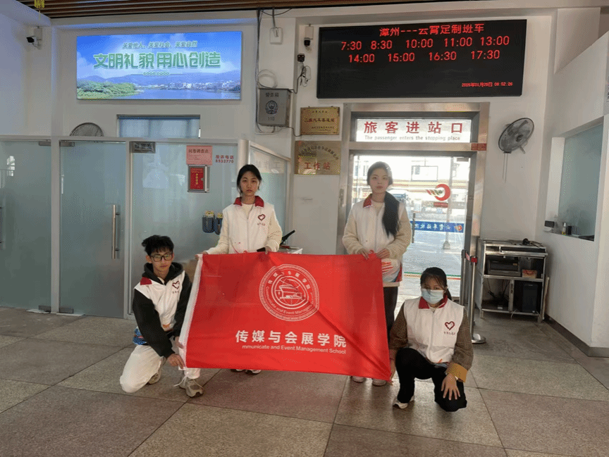 1 月 23 日至 25 日春运期间,我院学生实践队前往五板桥汽车站和人民公园公交站,参与由云霄县返乡大学生团委和漳州市长运集团云霄分公司组织、青少年宫为指导单位开展的“青春志愿行,温暖回家路”活动,让归乡游子在旅途中感受家的温暖。