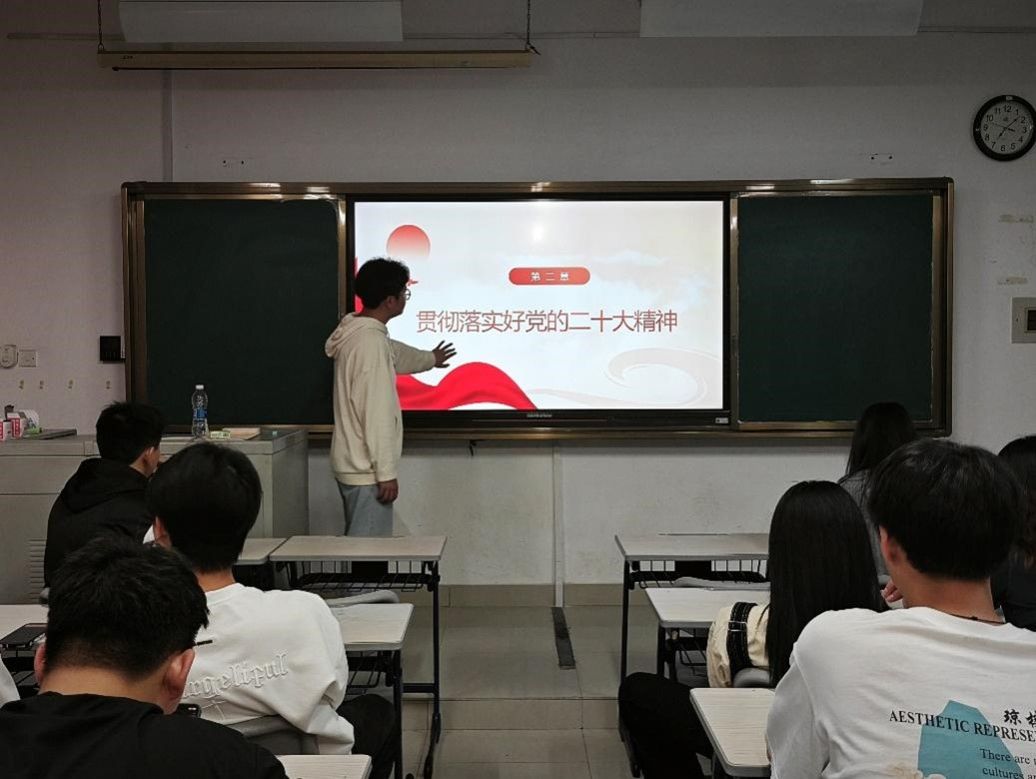 宣讲过程中,何梦珊同学简要介绍了十四届全国人大一次会议和全国政协十四届一次会议的内容,并详细阐述了此次会议对进一步动员全党全国各族人民为全面建设社会主义现代化国家、全面推进中华民族伟大复兴的重大意义。随后,王孔泷同学强调,学习党的二十大精神是当代青年学生需要掌握的核心素养,我们不仅要在学习上勤奋努力,还要在新时代新征程的奋斗全过程中,以始终不变的韧劲、坚定不移的执着,高举中国特色社会主义伟大旗帜,推动党和国家事业不断向纵深发展,为谱写新时代中国特色社会主义更加绚丽的华章点睛增色。