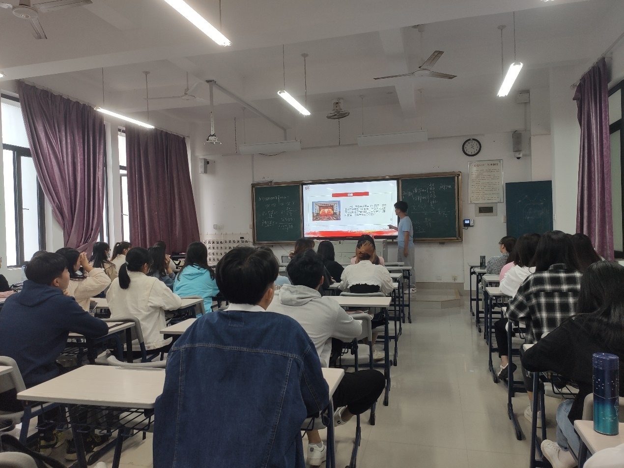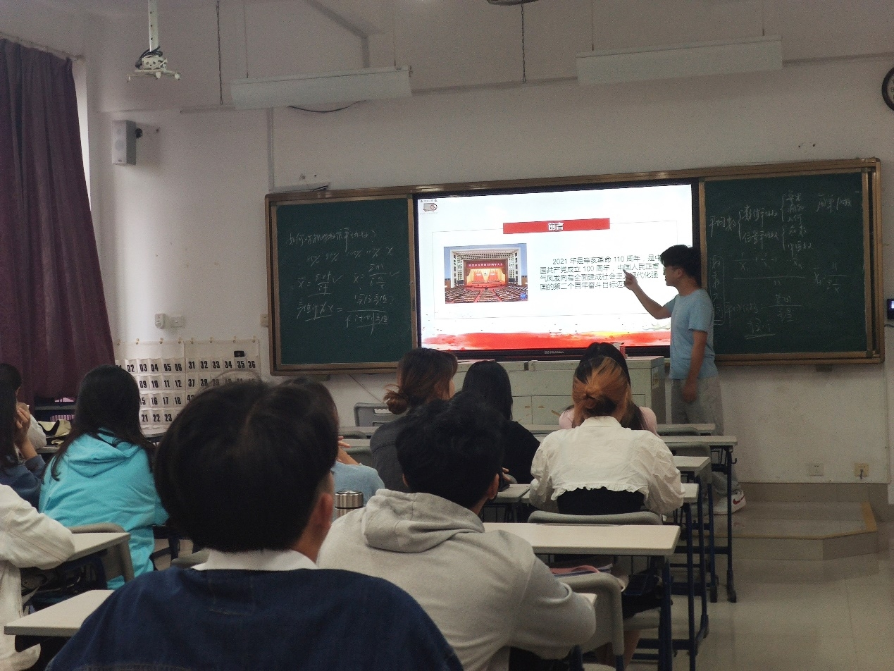 首先,组织委员林栩彤上台宣讲团课活动文件,从辛亥革命和孙中山先生的历史功绩、中国共产党人与孙中山革命事业的关系、辛亥革命的历史入手,指出辛亥革命对废除封建帝制、思想解放、除旧布新等历史进程的重要作用。通过对辛亥革命的起因、过程、影响的回顾,使同学从个人、民族、国家等多位角度认识到辛亥革命在漫漫民族历史长河中跨时代的里程碑式价值。其次,林栩彤同学也和大家共同学习了纪念辛亥革命110周年大会上的重要讲话内容。此外,也让在场同学意识到辛亥革命与中国共产党的紧密连接——中国共产党人从来都以孙中山的后继者自励,从来都尊崇孙中山为中华民族革命的伟大先行者。中国共产党成立100年来的发展,是对辛亥革命的继承。孙中山及一切革命者们憧憬的中华民族伟大复兴的美好前景,在中国共产党的领导下正在变为现实。最后,林栩彤同学言简意赅地总结了本次班会的中心思想,呼吁同学们应“不忘初心、牢记使命”,以自身的切实行动实现中华民族伟大复兴的征程不懈奋斗!