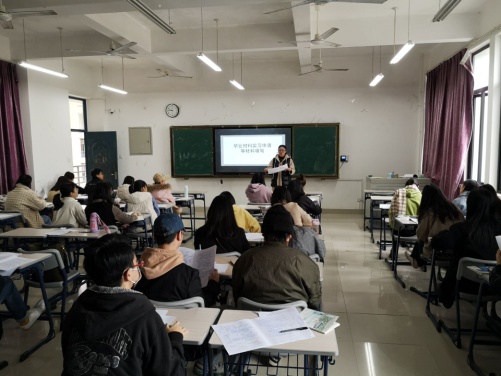 会上,辅导员丁育诗就近期校内外发生的安全事例进行教育和宣传,她提醒学生注意人身安全财产安全,提醒同学们在离校前做好宿舍关门、关窗、关水、关电等安全注意事项和学生宿舍卫生排查工作。同时实习期间要求同学们与指导老师、辅导员保持联系,工作时遵守规范,防止出现工伤等情况。最后,她强调毕业生实习、安全责任保证书等相关材料填写细则及注意事项,及毕业后关于党员档案的转接等。