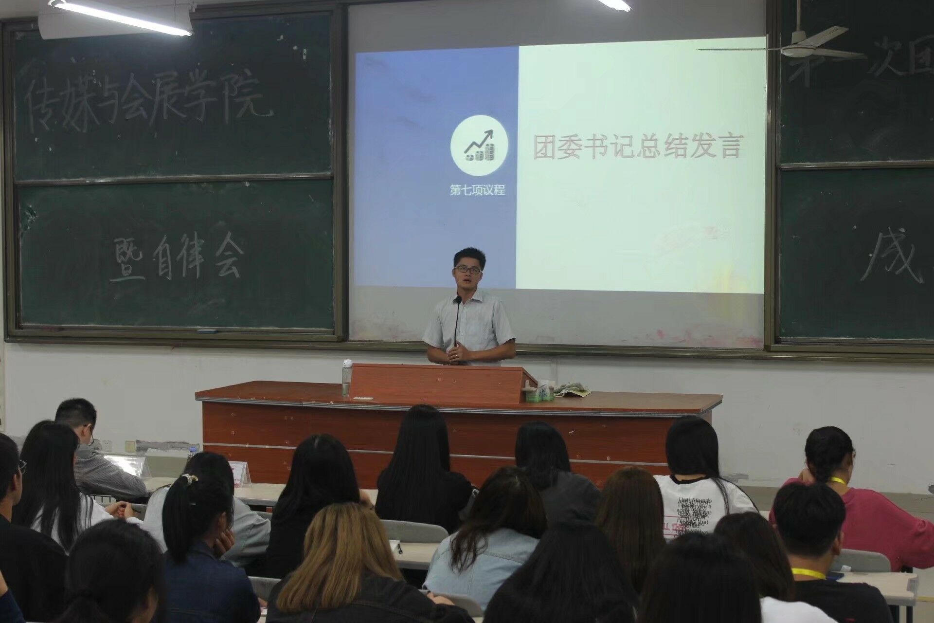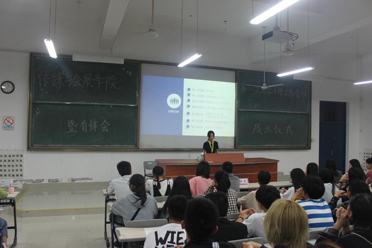 10月17日晚7点,yl6776永利集团新学期第一次团学干部工作会议暨院自律会成立仪式在诚信楼大阶2教室召开。学院团委书记胡瑞安、辅导员詹莉珍、陈圆圆、林振等老师及院团委学生会、自律会全体学生干部出席会议,会议由学生会副主席王迪同学主持。