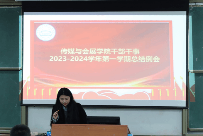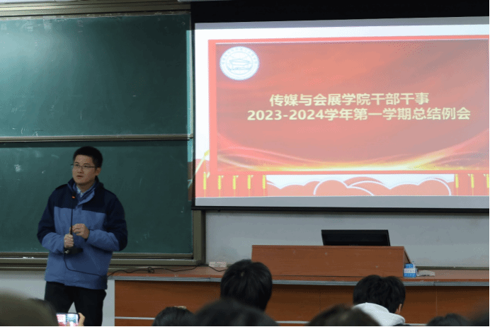 为总结本学期团学工作,进一步完善团学干部队伍建设,增强学生干部的凝聚力,传媒与会展学院于1月12日晚,在诚信楼中阶2教室召开三委部门干部干事2023-2024学年总结例会。会议由团委学生副书记欧阳亦芸主持,团委书记胡瑞安老师出席了本次会议。