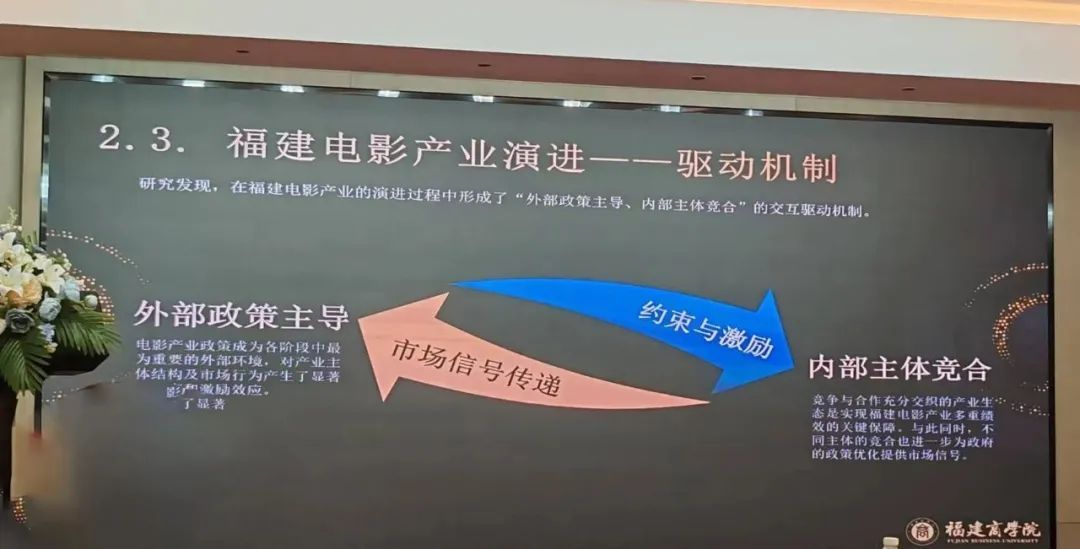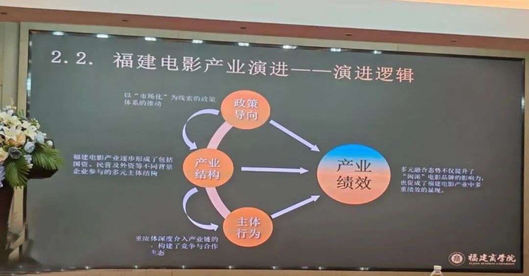 此次报告提出了 R - SCP 理论分析框架,涵盖政策语境(R)、主体结构(S)、市场行为(C)以及产业绩效(P),为解读福建电影产业提供了全面视角。福建电影产业的历史进程被清晰划分为萌芽起步期、产能扩大期、市场化改革期和深化合作期四个阶段,余权教授深入探讨了各阶段中政策演进、结构演进、行为演进以及绩效演进的特点,尤其以政策演进和结构演进为例,通过阐述政策演进的其中一个阶段和详细剖析结构演进在不同历史阶段与产业发展的紧密关联与变化规律,得出从福建电影产业的市场结构发展来看,在日益宽松积极的政策环境下,福建电影产业链逐步成型,并不断完善各类所有制背景的分析结果。