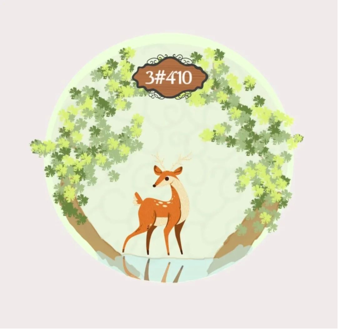 舍标以浅绿色为底色,加以融入元末明初春水玉的特殊底纹作为舍标的背景,用以反映我们宿舍的成员曾春妹和赖美玉,舍标中两边的树木代表的是宿舍成员林言璟,舍标中的小鹿代表的是宿舍成员芦淼。舍标以一幅春日景象呈现出我们宿舍是乐观积极向上、蓬勃向上的宿舍环境,舍标中展现的绿树清水便是象征着我们宿舍如同大自然环境一般和谐统一。我们坚信宿舍一定能够像美好的自然环境一般“绿水青山,便是金山银山”。