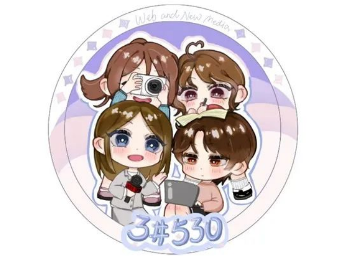 由4个形象不同的小女孩等要素构成,不同的表情与着装代表着不同的性格与形象。同时她们手中的相机,电脑,麦克风,书本又代表着所就读的专业:网络与新媒体。因为喜爱同一专业,缘分将两届学子聚集在530这个宿舍。可爱的互动寓意着融洽与互助。圆形的边框象征着530宿舍一体的决心和对人生能圆满希望。