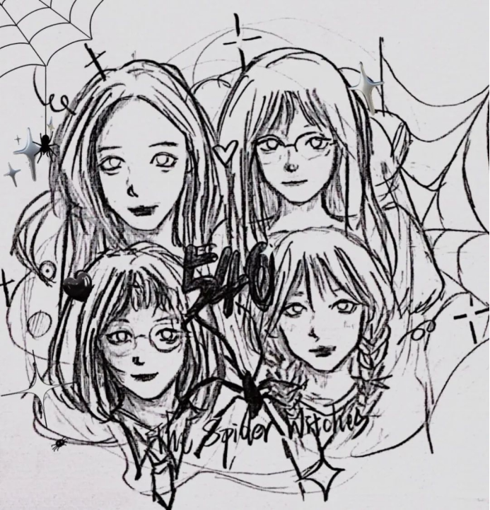 舍标主要由宿舍成员画像、宿舍号、宿舍英文名the spider witches(盘丝洞)组成,以手绘的形式、动漫的形象,展现出四个人不同的形象特点和蓬勃向上、积极进取的精神面貌。以宿舍号540为中心形成一个圆,代表着四个人以宿舍为中心团结一心,点缀的星星和爱心代表着每个人如同星星一般闪烁,如同爱心一般友爱。背景的蜘蛛网是盘丝洞的象征。光而不熠,与光同尘。以更加饱满的精神状态和更加扎实的行动力投入接下来的学习生活中,奔赴自己的星辰大海。