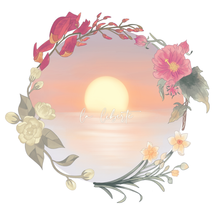 四周花束:分别是茉莉、水仙、刺桐、芙蓉,代表宿舍每个人来自不同城市的市花,整个舍标使用板绘原创设计海上初升的太阳,和朝霞代表新生的蓬勃和朝气,艺术字形式的英文单词意为自由,表现整个宿舍开朗豁达的氛围。