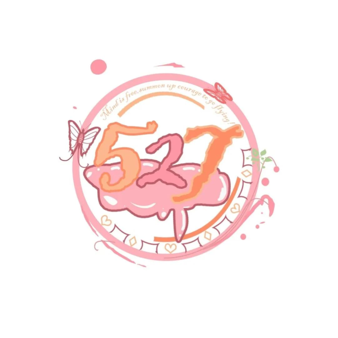 舍标寓意不改初衷、保持热爱、奔赴山海,外圈的圆点与波纹印征日光与山川。又以两只环绕的蝴蝶为意,代表着在勇敢的二十岁的我们同所有的浪漫与远方不期而遇,热爱每一份平淡的日常也是人生的花火。顶部英文代表自由的心要勇敢追梦。一片云上浮起527与左上的日光遥相呼应,在如浮云白日般的大学生活里,追寻山川四季的庄严温柔。