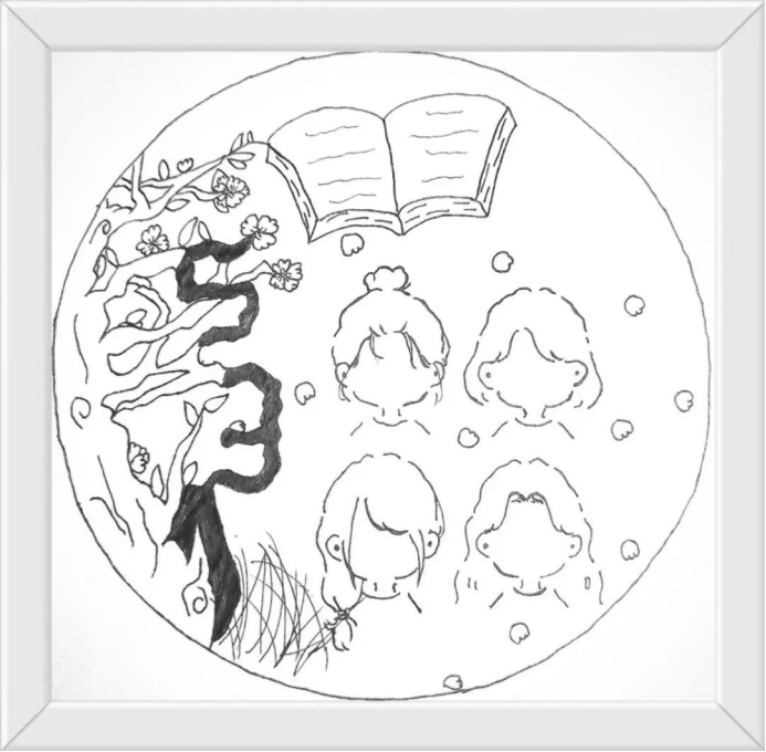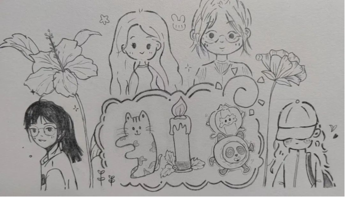 2022年9月13日,我们怀着友善相处的心在325相会。每个人都把325当作自己的小家,正如图片中的我们,被一颗大大的爱心紧紧包裹在一起,这寓意着325是一个充满爱的小家庭。图片里的四个女生拥有我们四个各自的特征,每个小人脸上都挂着甜甜的微笑是我们的相同之处。整个宿舍充满着欢声笑语是325的日常一幕。
