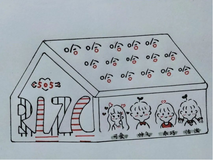 以“小房子”为主体设计,展现我们505温暖小家的形象。正门处取用家庭成员的名字首字母(阮R连L张Z陈C)收尾相连,组成一扇门,开启了属于我们的空间。侧面则是我们的卡通小形象:帅气、活泼、可爱、乖巧,与我们的性格一一对应着,充分体现当代大学生的“稚气”一面。瓦片的设计则采用了“哈”字的艺术字,生动形象地反映我们寝室的嘻哈日常,仿佛505的爽朗笑声已经回荡在耳畔。