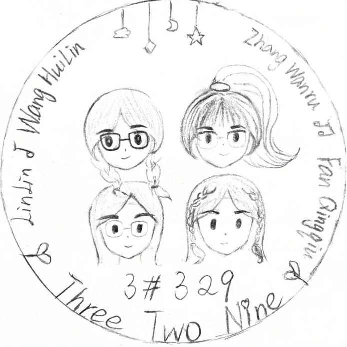 舍标主要由宿舍号、宿舍成员Q版画像以及名字拼音组成。四个女孩分别代表了宿舍内的四个成员,我们都有自己鲜明的性格特征,都是与众不同的,但因为缘分我们相聚在了329。四个人的名字围成了一个圆,就像我们宿舍内团结和谐的氛围一样。我们会一起唱歌,一起数星星看月亮。我们都爱329这个小地方,爱329内的每一个人。