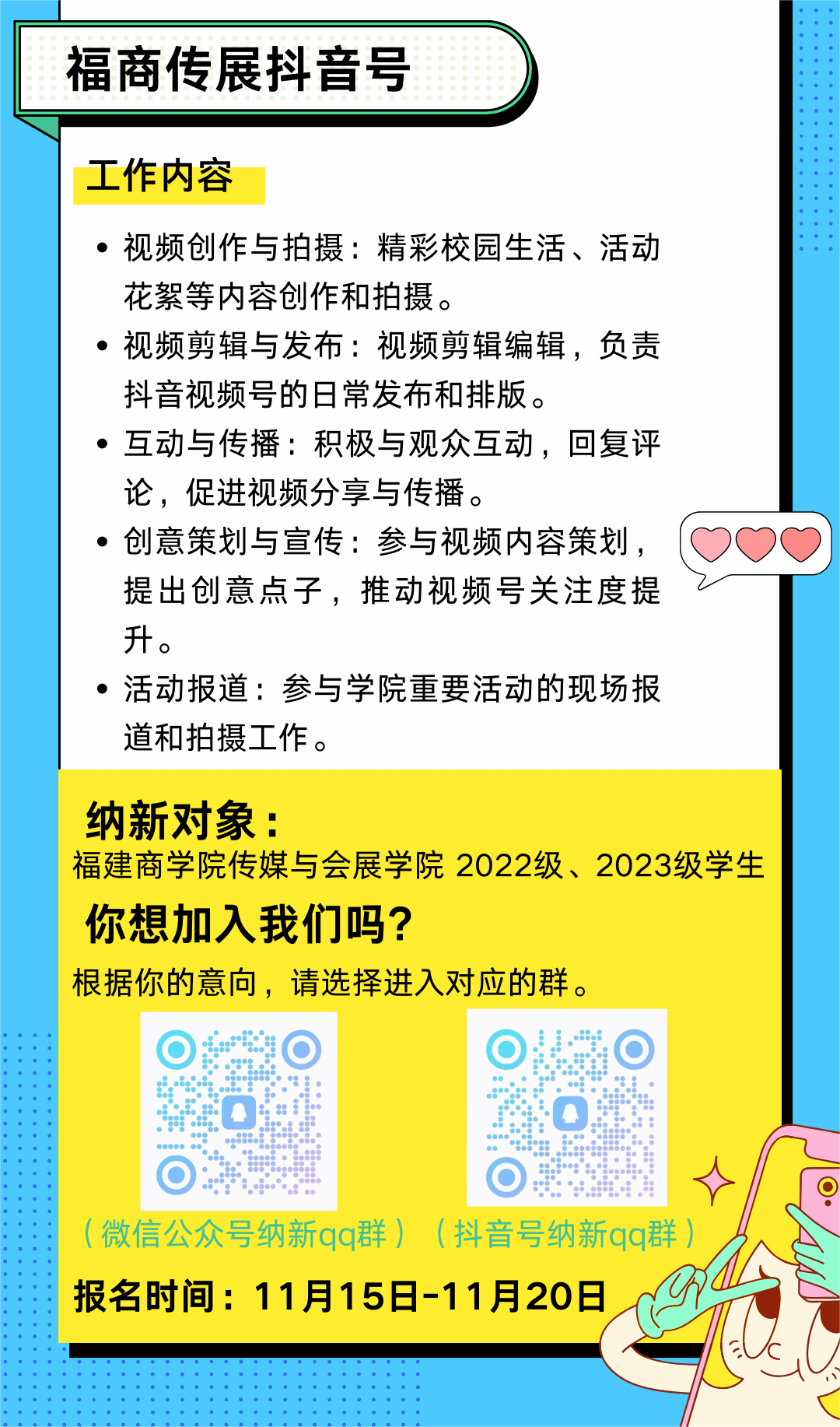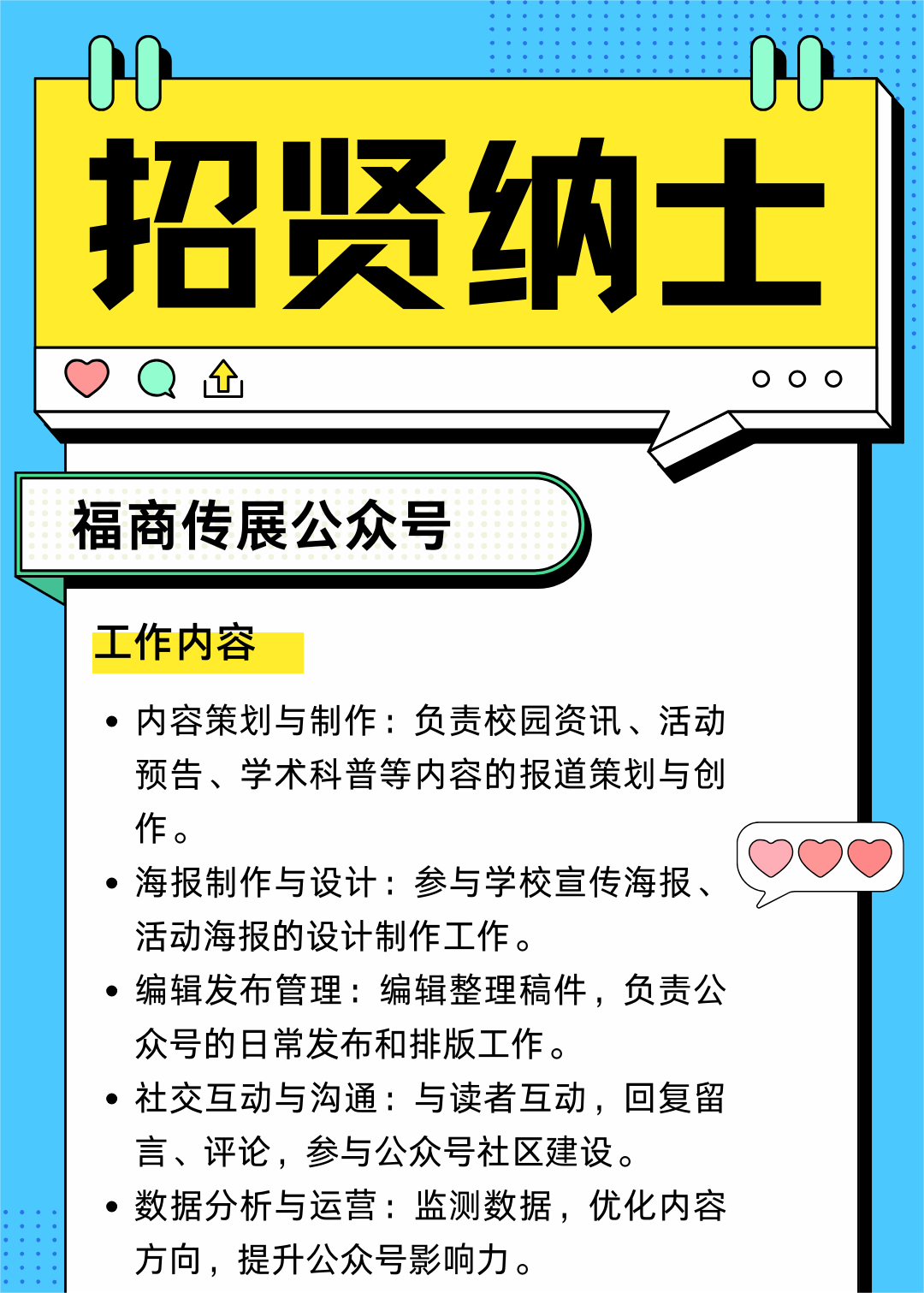 福商传媒工作室成立于今年9月,是yl6776永利集团官方信息发布平台,也是学生开展专业实践的重要途径,工作室现下设微信公众号运营团队,抖音号运营团队。为更好服务学院师生、提升学生专业技能,工作室现正式启动纳新工作。