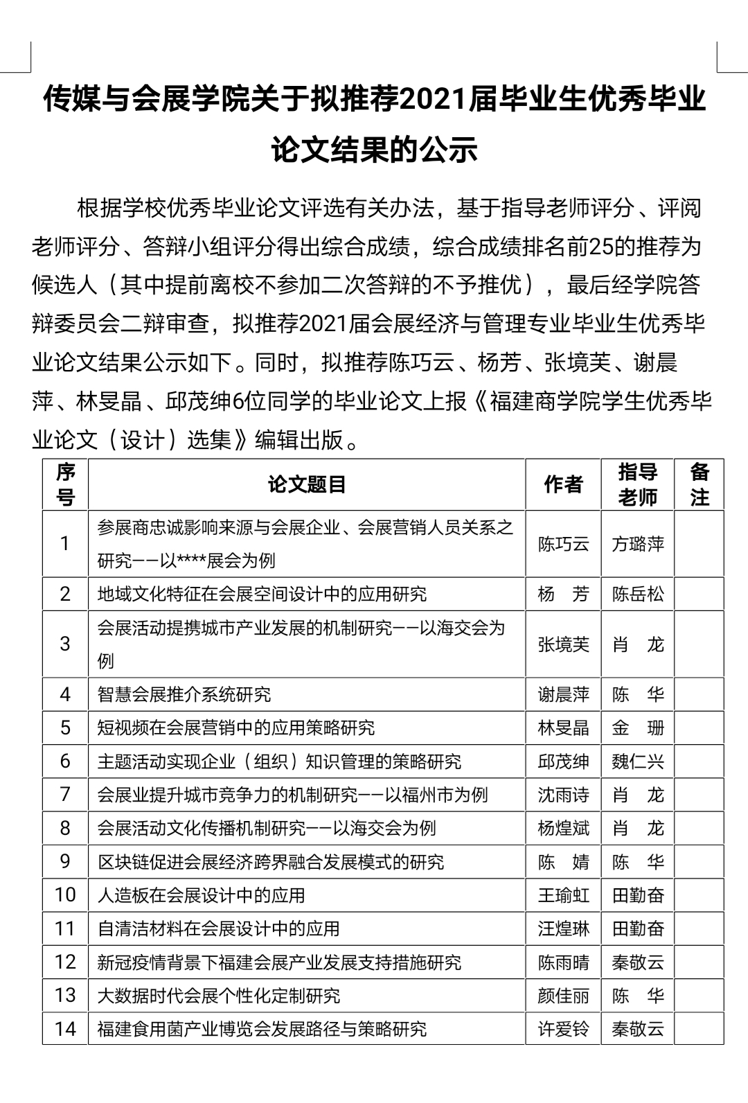 yl6776永利集团关于拟推荐2021届毕业生优秀毕业论文结果的公示