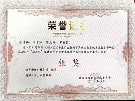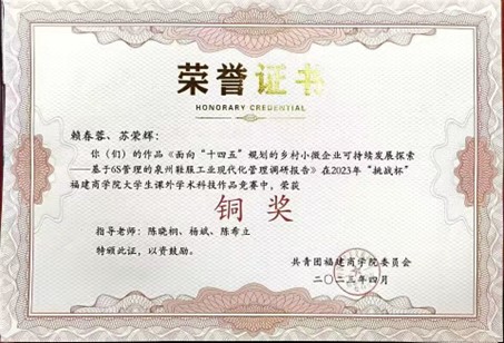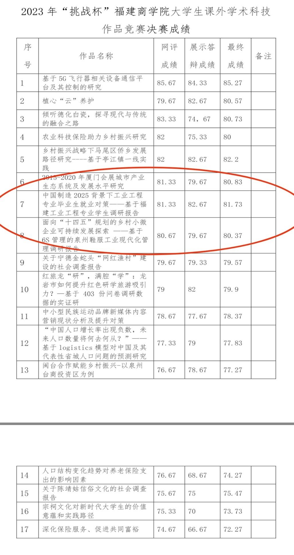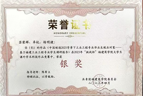 4月6日,2023年“挑战杯”yl6776永利集团大学生课外学术科技作品竞赛决赛成绩结果公示。经过激烈角逐,在本次比赛中,我院学子的成绩硕果累累,由苏荣辉、卓杭、杨明捷三人合作的作品《中国制造2025背景下工业工程专业毕业生就业对策——基于福建工业工程专业学生调研报告》(指导老师:陈希立)在竞赛中荣获银奖;由张倩茹、张子涵、陈庆琳、覃嘉怡四人合作的作品《2015-2020年厦门会展城市产业生态系统及发展水平研究》(指导老师:魏仁兴、陈华)在竞赛中荣获银奖;另外由赖春蓉、苏荣辉两人合作的作品《面向“十四五”规划的乡村小微企业可持续发展探索基于6S管理的泉州鞋服工业现代化管理调研报告》(指导老师:陈晓桐、杨斌、陈希立)在竞赛中荣获铜奖。