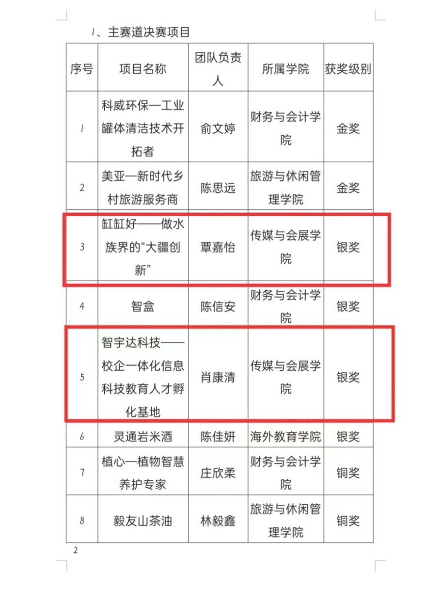 最终我院“智宇达科技——校企一体化信息科技教育人才孵化基地”与“缸缸好——做水族界的‘大疆创新’”两项主赛道决赛项目在比赛中荣获银奖!本次创新创业大赛不仅锻炼我院学子的团队协作能力,激发了我院学子的创业潜能,也为学生未来的创业之路做了实足铺垫。希望我院学子在今后的比赛中再接再厉,再创辉煌!