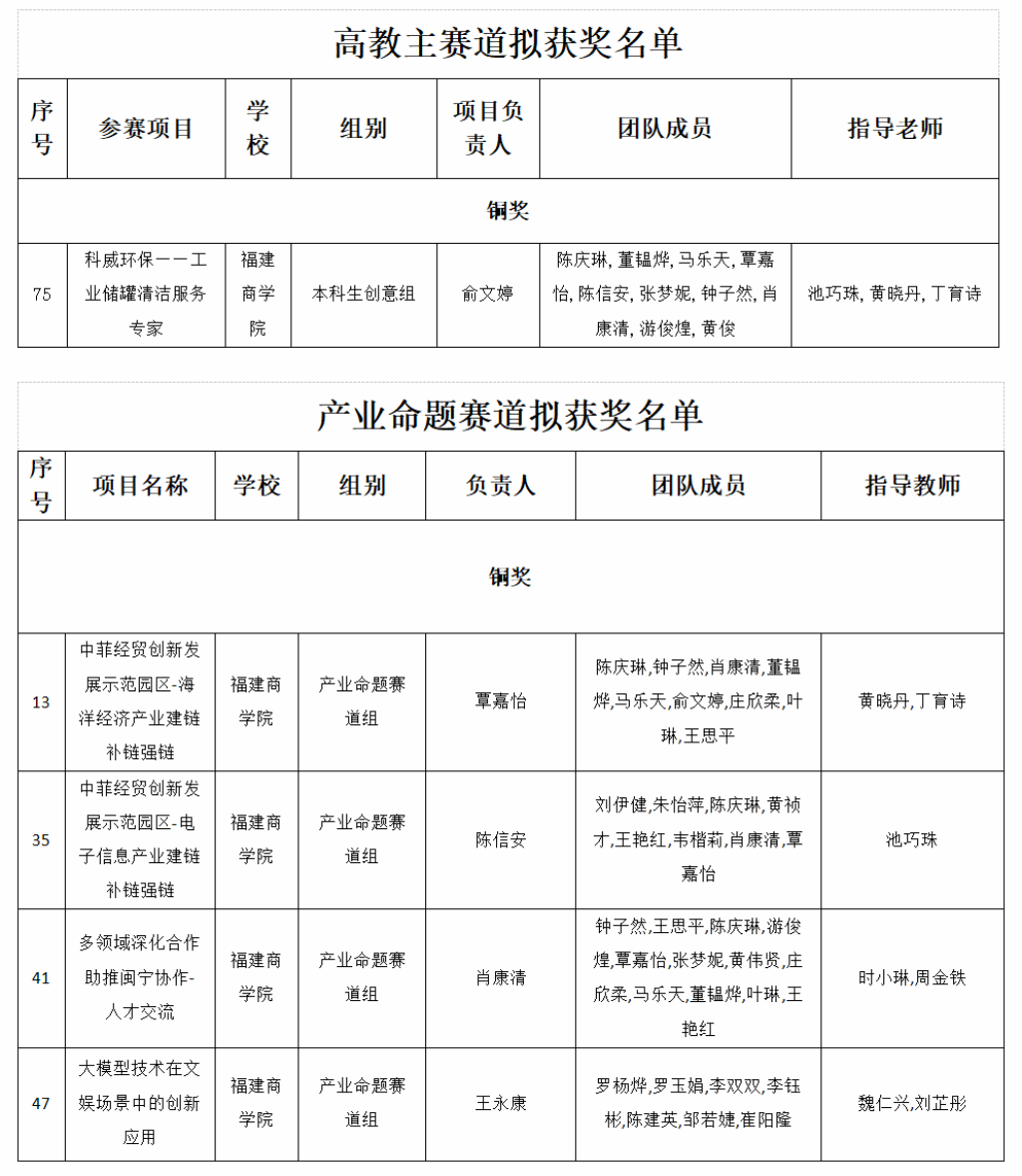2023年8月31日,福建省教育厅公布《关于第九届中国国际“互联网+”大学生创新创业大赛福建省赛拟获奖名单的公示》,我院覃嘉怡、肖康清、王永康同学分别申报的《中菲经贸创新发展示范园区-海洋经济产业建链补链强链》项目(参与成员:陈庆琳、钟子然、董韫烨、马乐天、俞文婷、庄欣柔、叶琳、王思平,指导教师:黄晓丹、丁育诗)、《多领域深化合作助推闽宁协作-人才交流》项目(参与成员:钟子然、王思平、陈庆琳、游俊煌、覃嘉怡、张梦妮、黄伟贤、庄欣柔、马乐天、董韫烨、叶琳、王艳红,指导教师:时小琳、周金铁)、《大模型技术在文娱场景中的创新应用》项目(参与成员:罗杨烨、罗玉娟、李双双、李钰彬、陈建英、邹若婕、崔阳隆,指导教师:魏仁兴、刘芷彤)荣获产业命题赛道省赛铜奖。