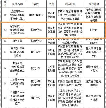 2022年8月,据第八届福建省“互联网+”大学生创新创业大赛获奖名单显示,我院申报的《智宇科技——信息科技教育人才孵化体系》项目荣获本科生创意组高教主赛道银奖(项目负责人:陈子为;指导老师:时小琳)。另外,多名我院同学参与的项目《智合科技——家庭智能健康厨电智造者》(指导老师:时小琳)也荣获本科生创意组高教主赛道银奖,实现本学院在该赛事奖项级别方面的突破。