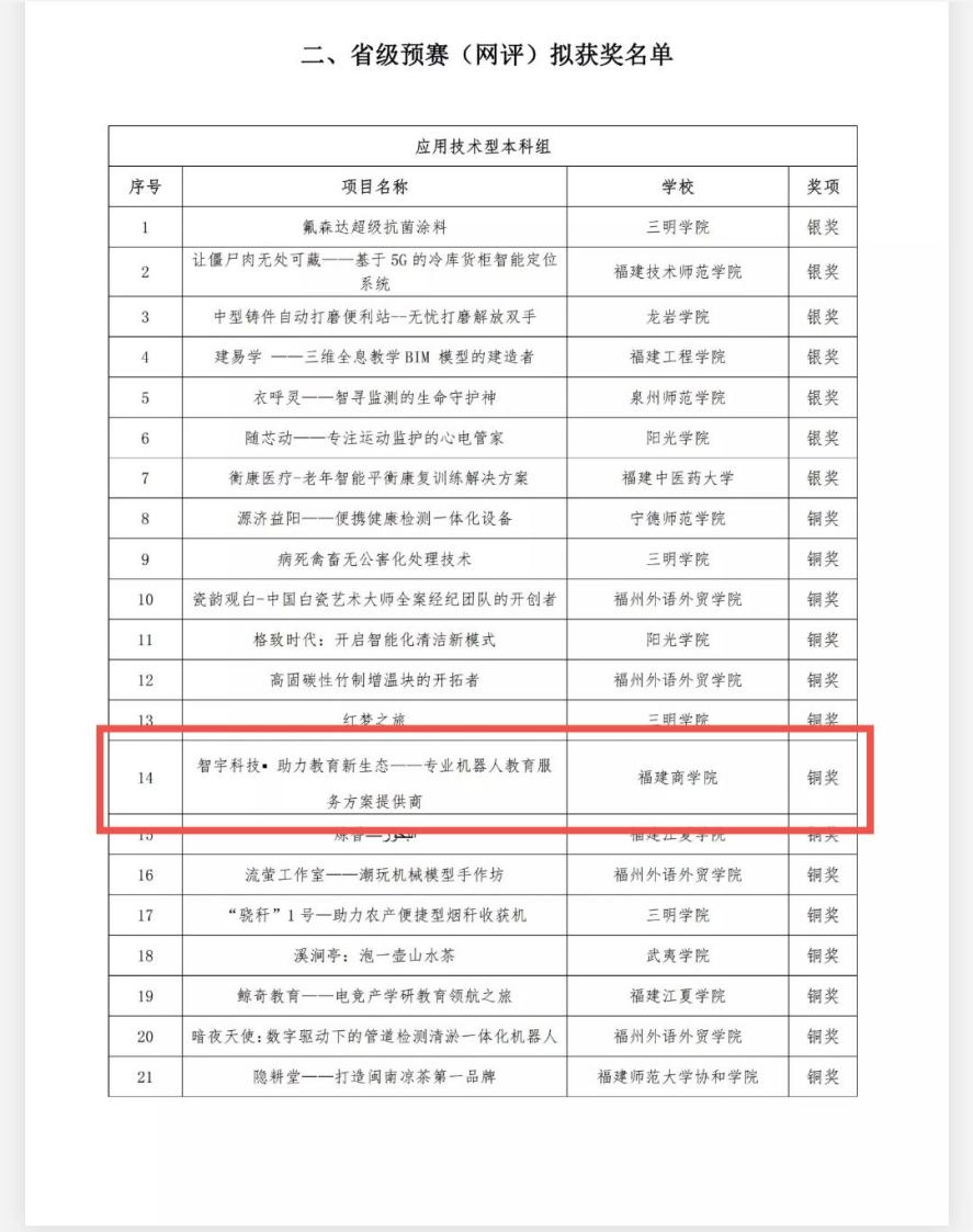 8月1日,第七届福建省“互联网+”大学生创新创业大赛职教赛道暨第五届黄炎培海峡职业教育创新创业大赛拟获奖名单公布,我院申报的《智宇科技·助力教育新生态——专业机器人教育服务方案提供商》项目荣获铜奖(团队负责人:陈子为;指导老师:时小琳)。
