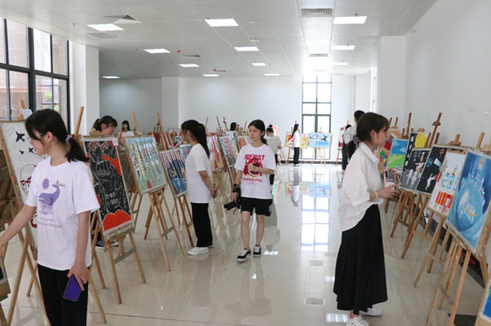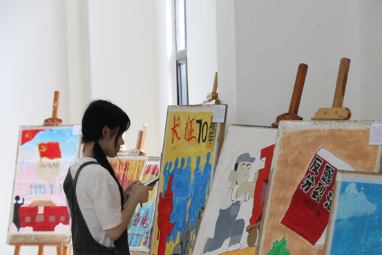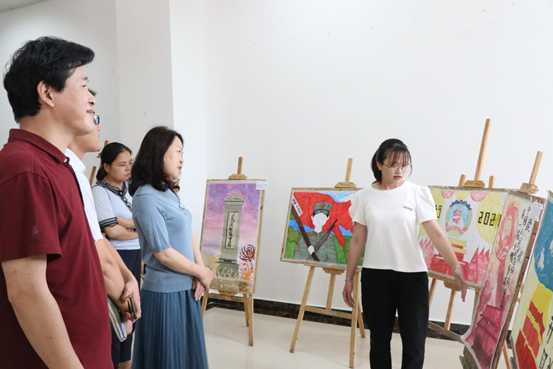 展览现场,校党委副书记徐晓丹老师认真欣赏了同学们的作品,对同学们的创作表示了肯定。徐副书记表示,“要相信学生们的潜力,通过动手创作方式与党史学习结合,对“四史”有了更多认识,更能使学生们收获深刻的感悟,相信我们的学生是可以做的更好的。”