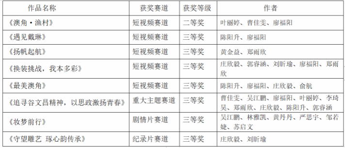 我院教师金珊指导的8部影像作品分获“福建省传播学会第十届大学生影像大赛”二、三等奖(见下表),此次大赛由福建省传播学会和福建省传播学会实践专委会主办,至今已成功举办了十届,是全省重要的高校年度学术交流和实践创作成果展示平台,共有全省近31所高校的1200部作品参赛,经多轮评审,共有331部作品获奖。