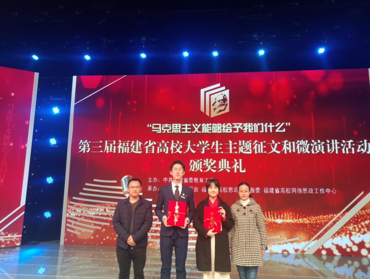 12月4日,第三届福建省高校大学生“马克思主义能给予我们什么暨我和我的祖国”主题征文和微演讲活动总决赛落下帷幕。经过激烈角逐,我院2018级会展经济与管理2班王德文同学的作品《闽宁山海携手,共赴全面小康 》获得本科生组二等奖;由王德文同学演讲、2018级会展经济与管理2班陈姝婷同学的作品《点燃信仰之灯,“垃圾村”美丽蝶变 》获得本科生组三等奖。
