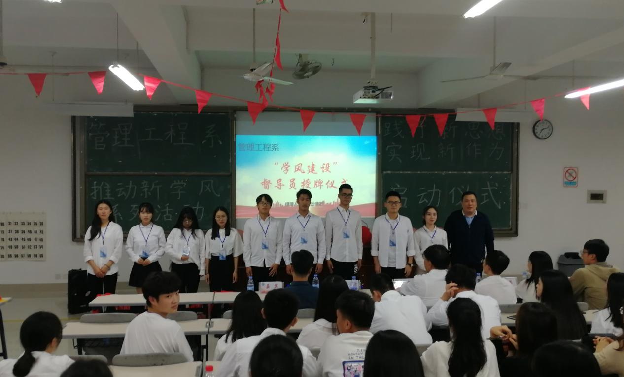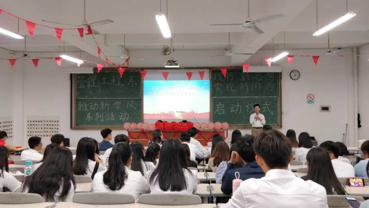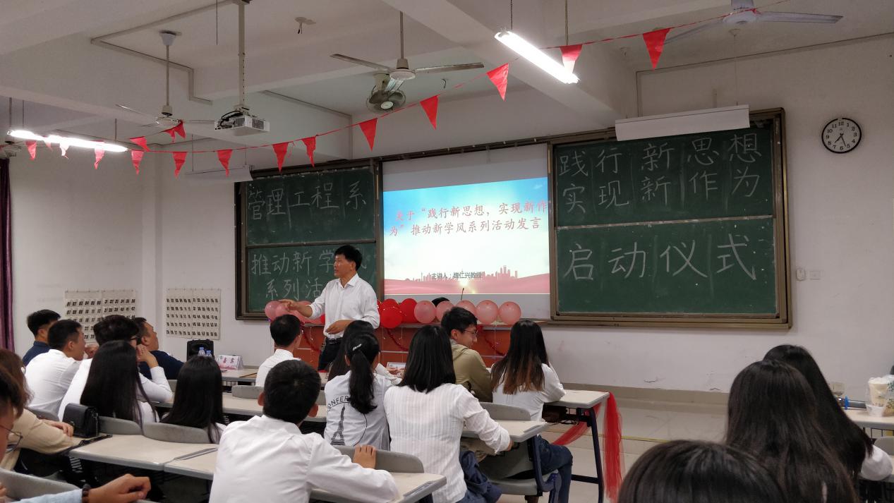 2018年10月23日晚七点,管理工程系团总支在诚信楼中阶三举行以“践行新思想,实现新作为”为主题的推动学风系列活动的启动仪式。出席本次活动的主要嘉宾有管理工程系党总支副书记郭海云、系主任魏仁兴、博士肖龙、团总支书记曾逸群和辅导员詹巧霞。