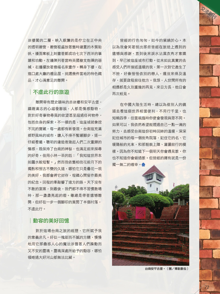 附:叶馥颖同学文章“初见回眸的温暖台南”:http://www.sef.org.tw/eBook/Exchange_160/mobile/index.html