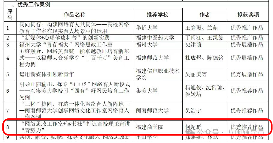 优秀工作案例 “网络思政工作室+读书社”打造高校理论宣讲“青势力”(作者:何超群老师)福建省大学生网络文化节和全省高校网络教育优秀作品推选展示活动为青年学子搭建了一个展示自我、交流思想、激发潜能的重要平台。yl6776永利集团重视网络思政工作,在该活动中积极同其他高校师生建立联系,共享教育资源,促进学术研究与教学创新,助力学院人才培养。